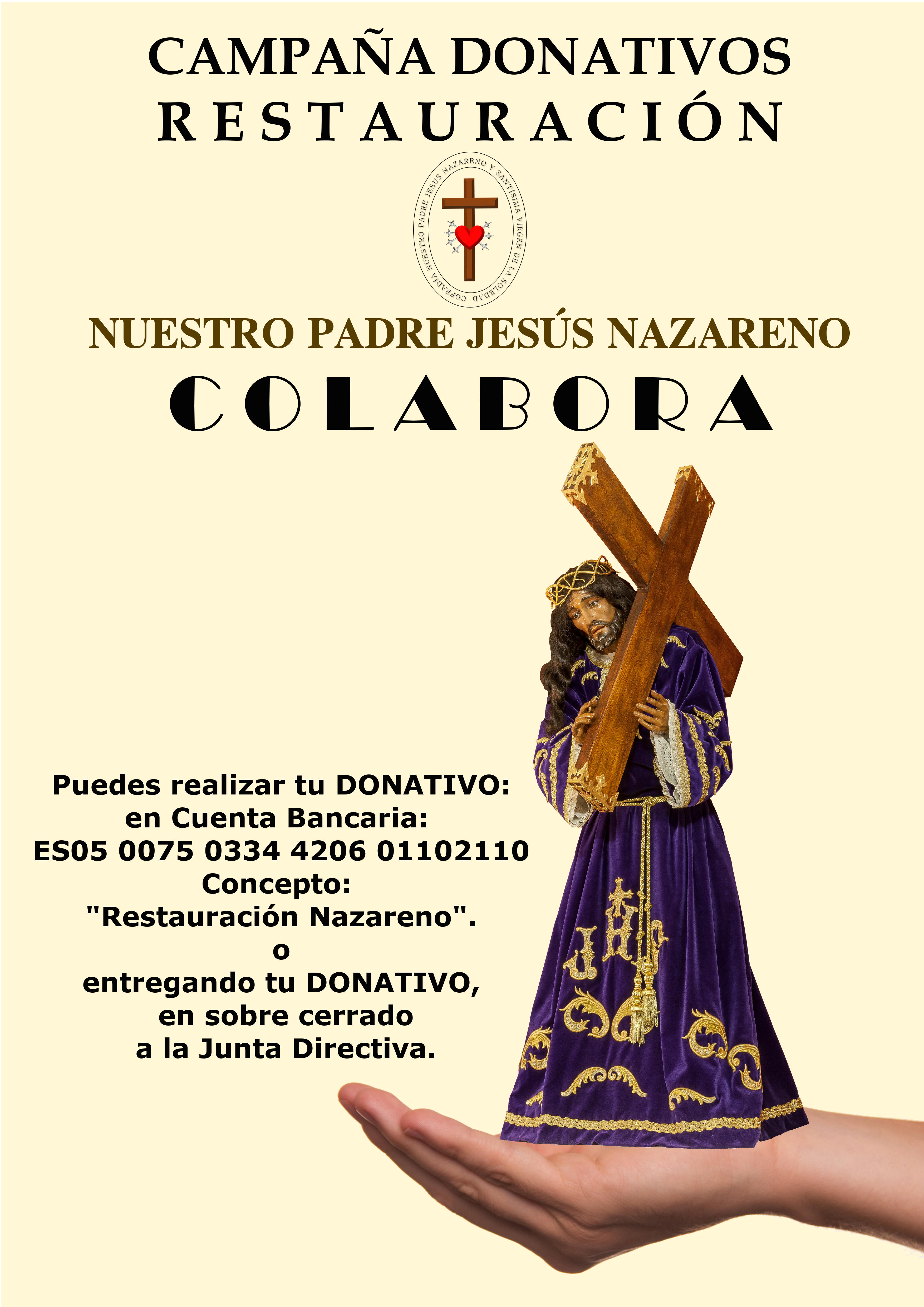 Tal y como realizamos para las restauraciones de la Santísima Virgen de la Soledad  y del Cristo de la Misericordia. Se encuentra abierta la “CAMPAÑA DE DONATIVOS RESTAURACIÓN: NUESTRO PADRE JESÚS NAZARENO”.  Podéis colaborar con vuestros donativos, grandes o pequeños, cualquier ayuda es bien recibida de las siguientes formas: