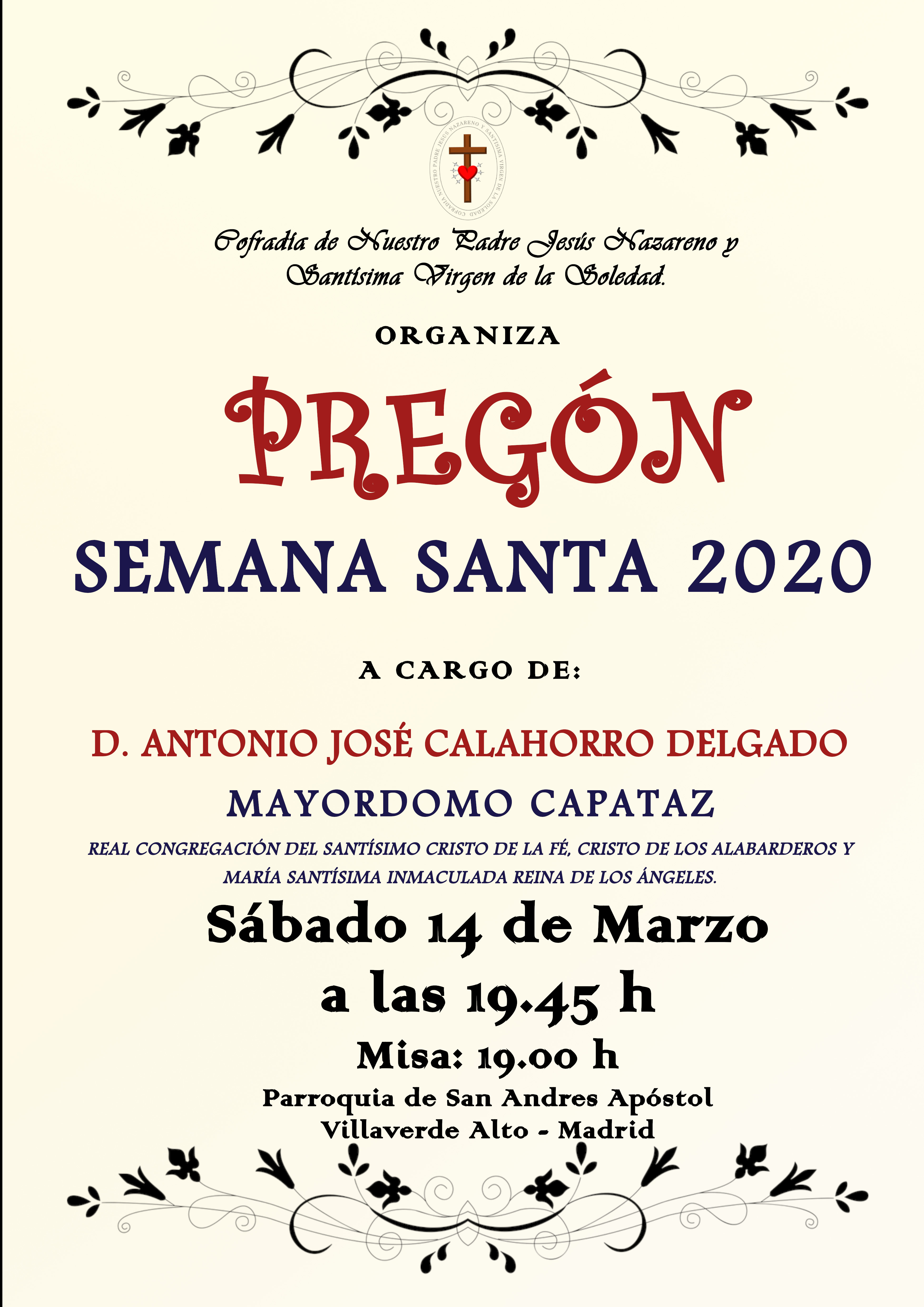 Nos complace anunciaros, que el próximo 14 de Marzo, tendrá lugar el PREGÓN SEMANA SANTA 2020, que este año estará a cargo de D. Antonio José Calahorro Delgado, Mayordomo Capataz de la Real Congregación del Santísimo Cristo de la Fé, Cristo de los Alabarderos y María Santísima Inmaculada Reina de los Ángeles. También el mismo día se procederá a la Presentación Oficial del Cartel para esta Semana Santa 2020.