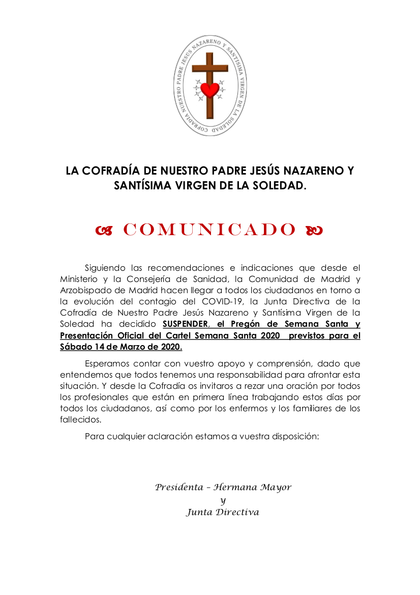 La Cofradía, quiere compartir con todos vosotros este comunicado: