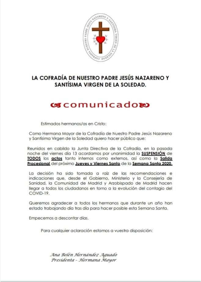 Desde la Cofradía de Nuestro Padre Jesús Nazareno y Santísima Virgen de la Soledad, la Presidenta – Hermana Mayor emite este COMUNICADO.