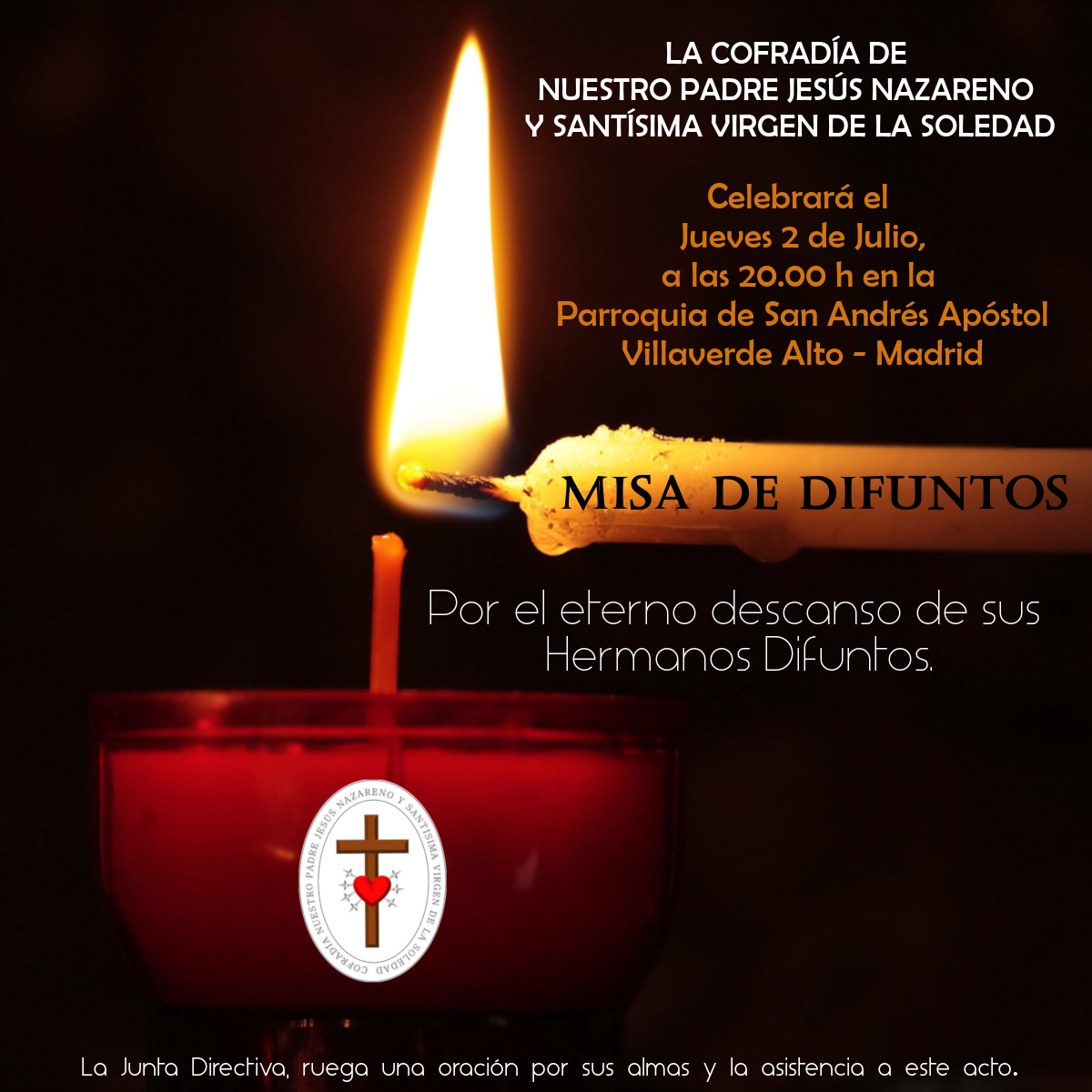 La declaración del Estado de Alarma impidió que pudiera celebrarse. Y ahora que nos encontramos en esa «nueva normalidad», os podemos anunciar que el próximo día 2 de Julio a las 20.00 h se celebrará la Misa de Difuntos por el eterno descanso de los hermanos fallecidos de la Cofradía, especialmente en el ultimo año y por los que nos han dejado en este tiempo de pandemia.