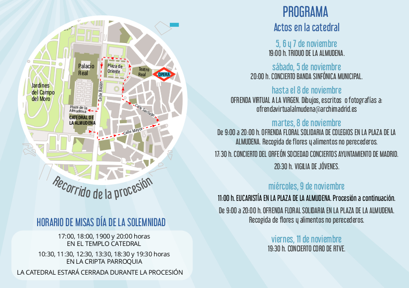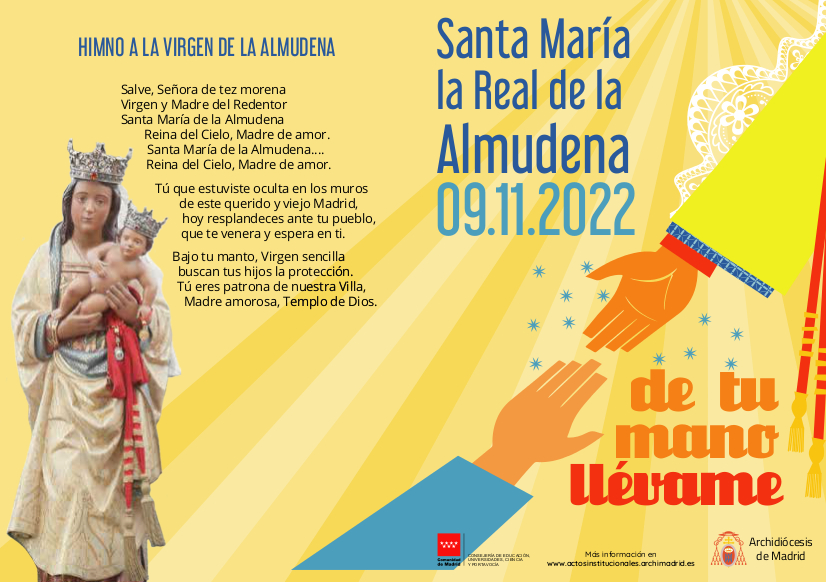 Y entonando el HIMNO en su honor, os recordamos el horario de la misa y procesión, y os deseamos ¡Un feliz día a tod@s!. Y nuestras felicitaciones en su día a todas las Almudena.
