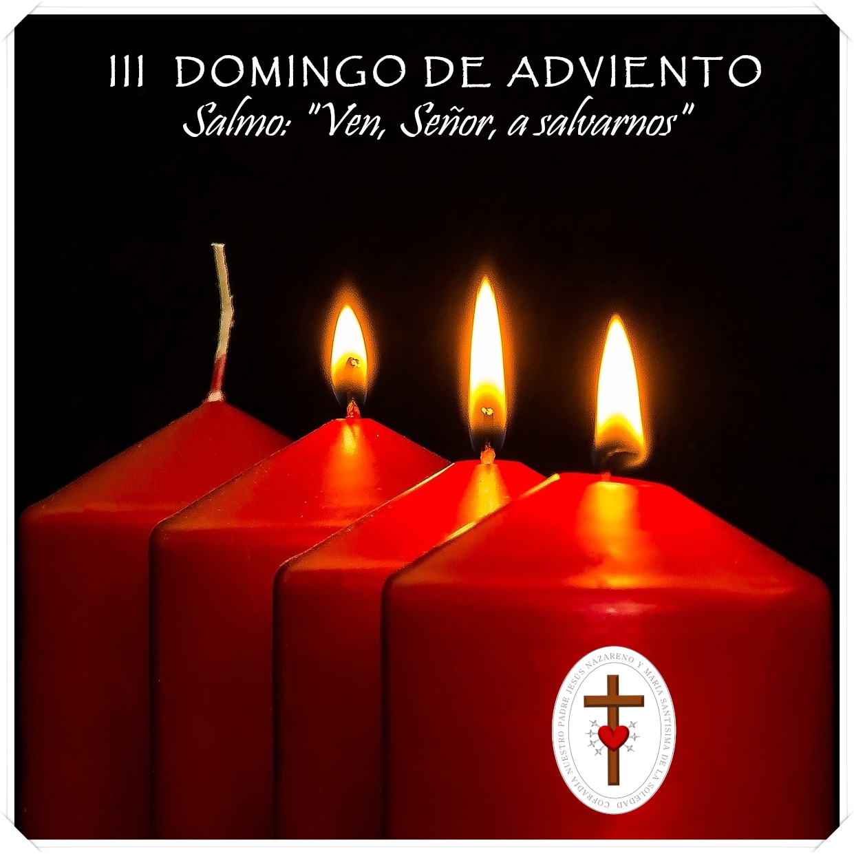 Hoy domingo 11 de Diciembre, celebramos el TERCER DOMINGO DE ADVIENTO, encenderemos la tercera vela de la corona, que nos recuerda que cada vez más cerca está el Señor.