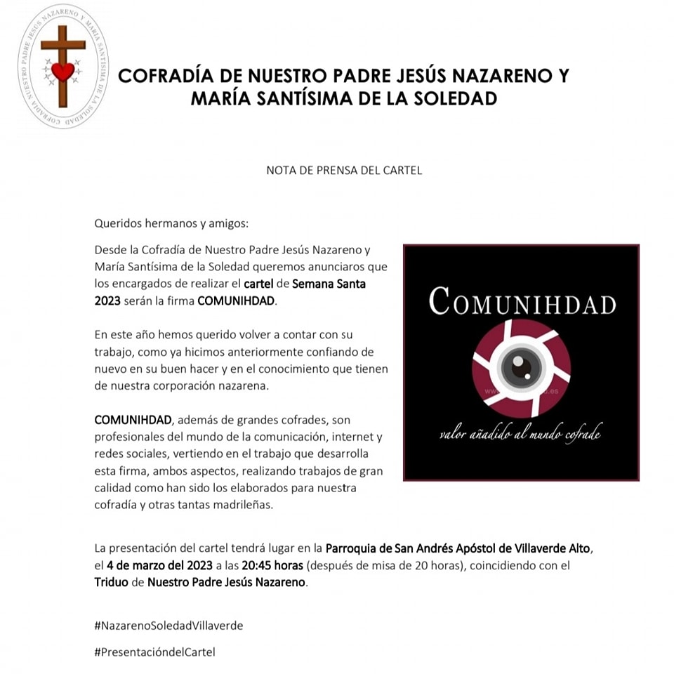 Desde la Cofradía de Nuestro Padre Jesús Nazareno y María Santísima de la Soledad queremos anunciaros que los encargados de realizar el cartel de Semana Santa 2023 serán la firma COMUNIHDAD. Comunihdad
