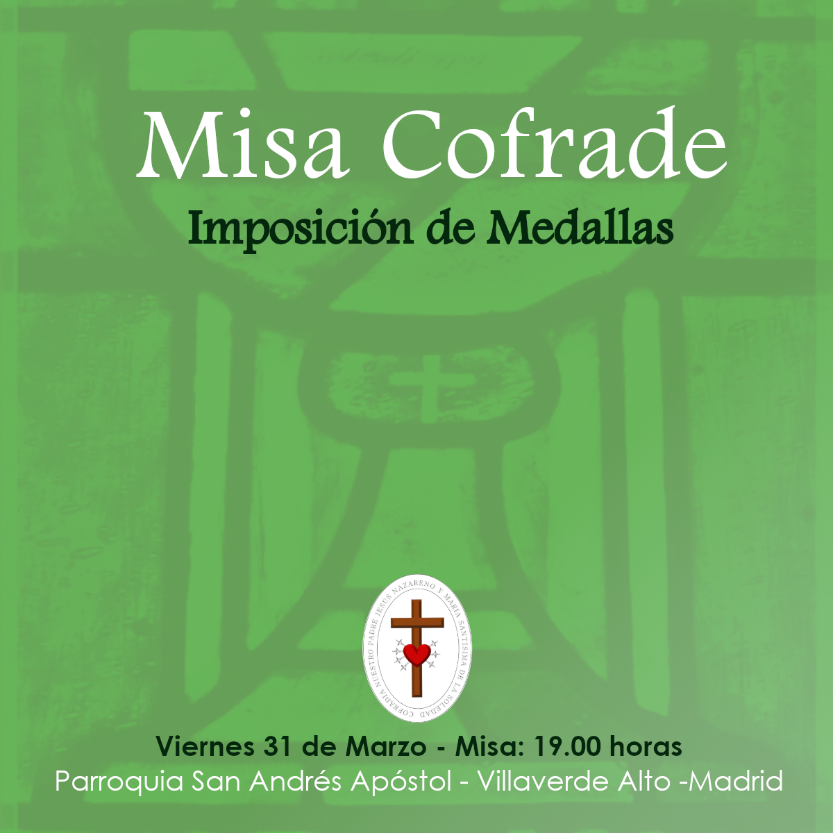 27 de marzo de 2023 Os recordamos que el próximo viernes 31 de Marzo a las 19.00 horas, tendrá lugar la tradicional Misa Cofrade, con la imposición de medallas a los nuevos hermanos. ¡Os esperamos!.