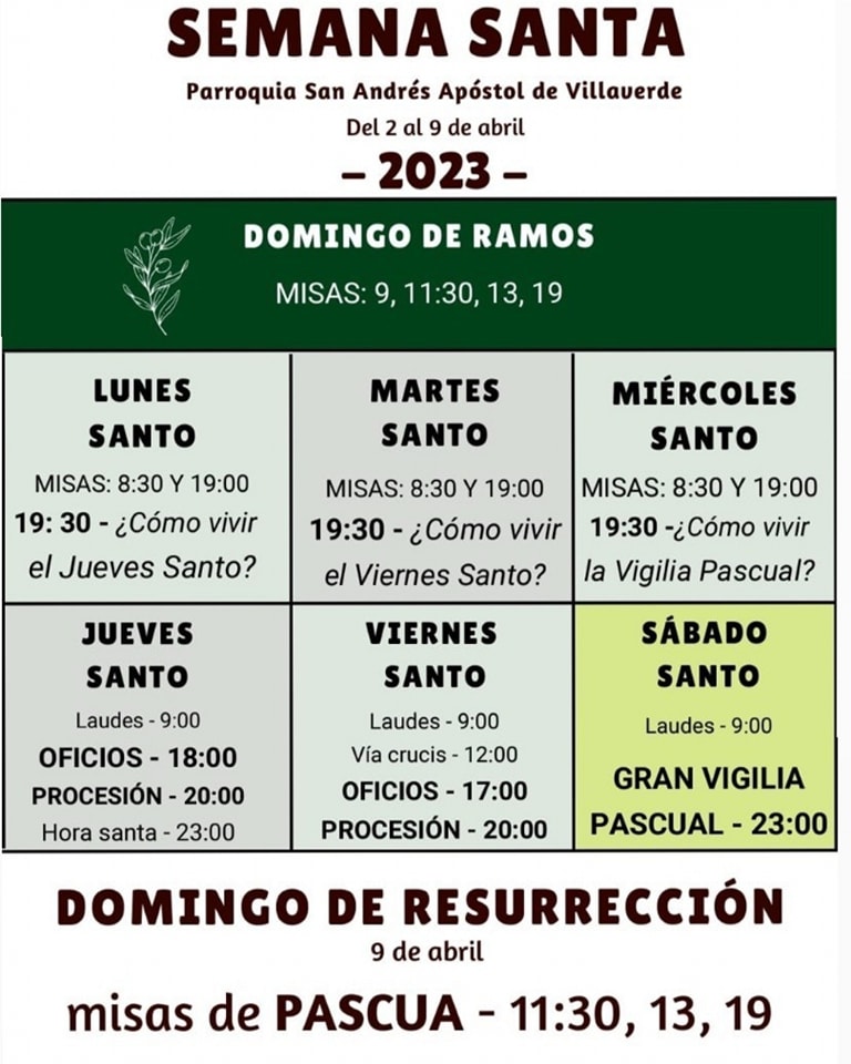 Desde la Parroquia, han preparado un cuadro con los horarios de los diferentes actos que tendrán lugar a lo largo de esta Semana Santa. Nuestra parroquia nos propone cada día una catequesis para preparar y vivir la Pasión, Muerte y Resurrección de Nuestro Señor.