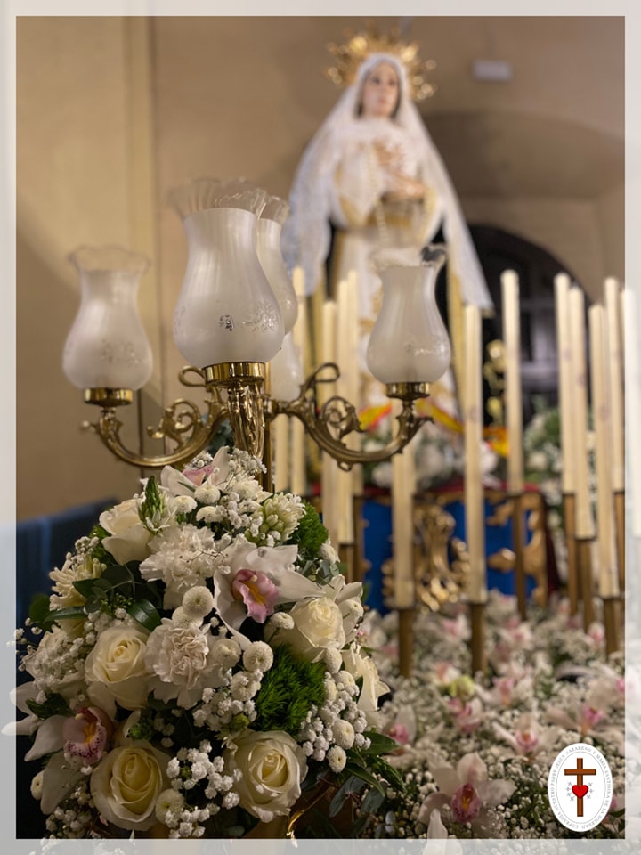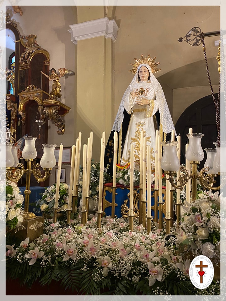 María Santísima de la Soledad : Llevaba un manto de cymbidium blanco y paniculata blanca. Acompañada de seis copas o piñas de rosas blancas, cymbidium blanco, eucalipto, jacintos, margarita de botón blanca, claveles verdes y blancos.