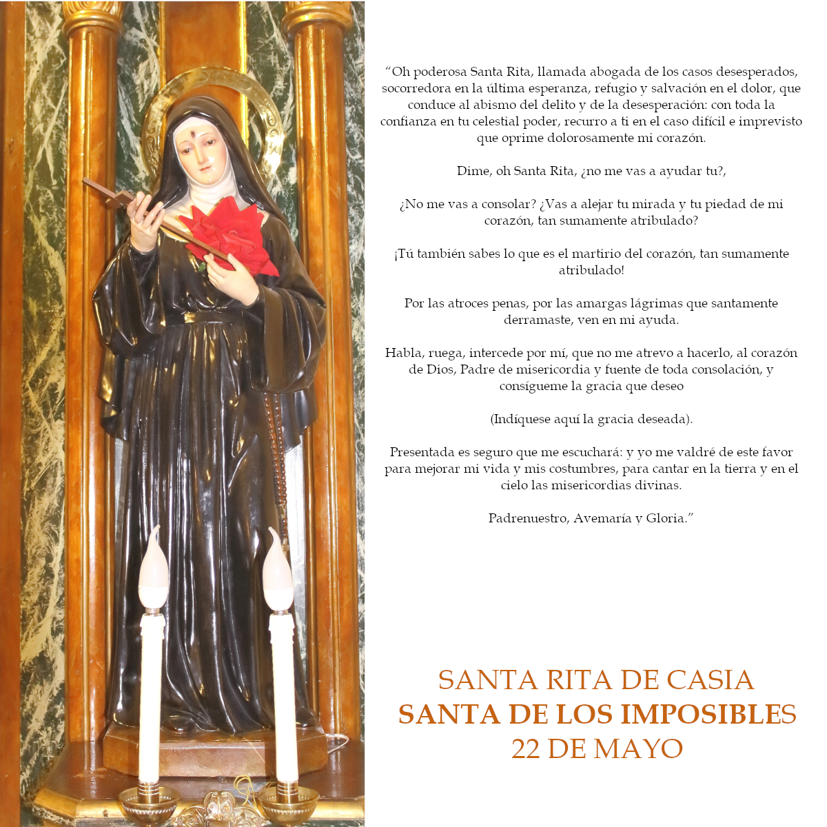 22 de mayo de 2023 Hoy 22 de Mayo, es el día de Santa Rita de Casia, abogada de lo imposible. Ella acompaña todo el año a María Santísima de la Soledad en su altar. Y hoy le ofrecemos esta oración por todos aquellos que atraviesan momentos difíciles.