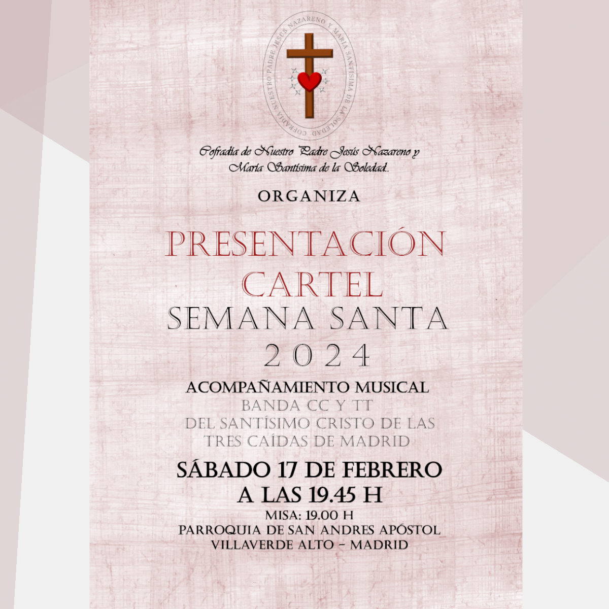 15 de febrero de 2024 RECORDATORIO El próximo sábado 17 de Febrero, tendrá lugar el Acto de presentación del cartel de la Semana Santa 2024, con el acompañamiento musical de la Banda de CC y TT del Santísimo Cristo de las Tres Caídas de Madrid. !Os esperamos a tod@s!.