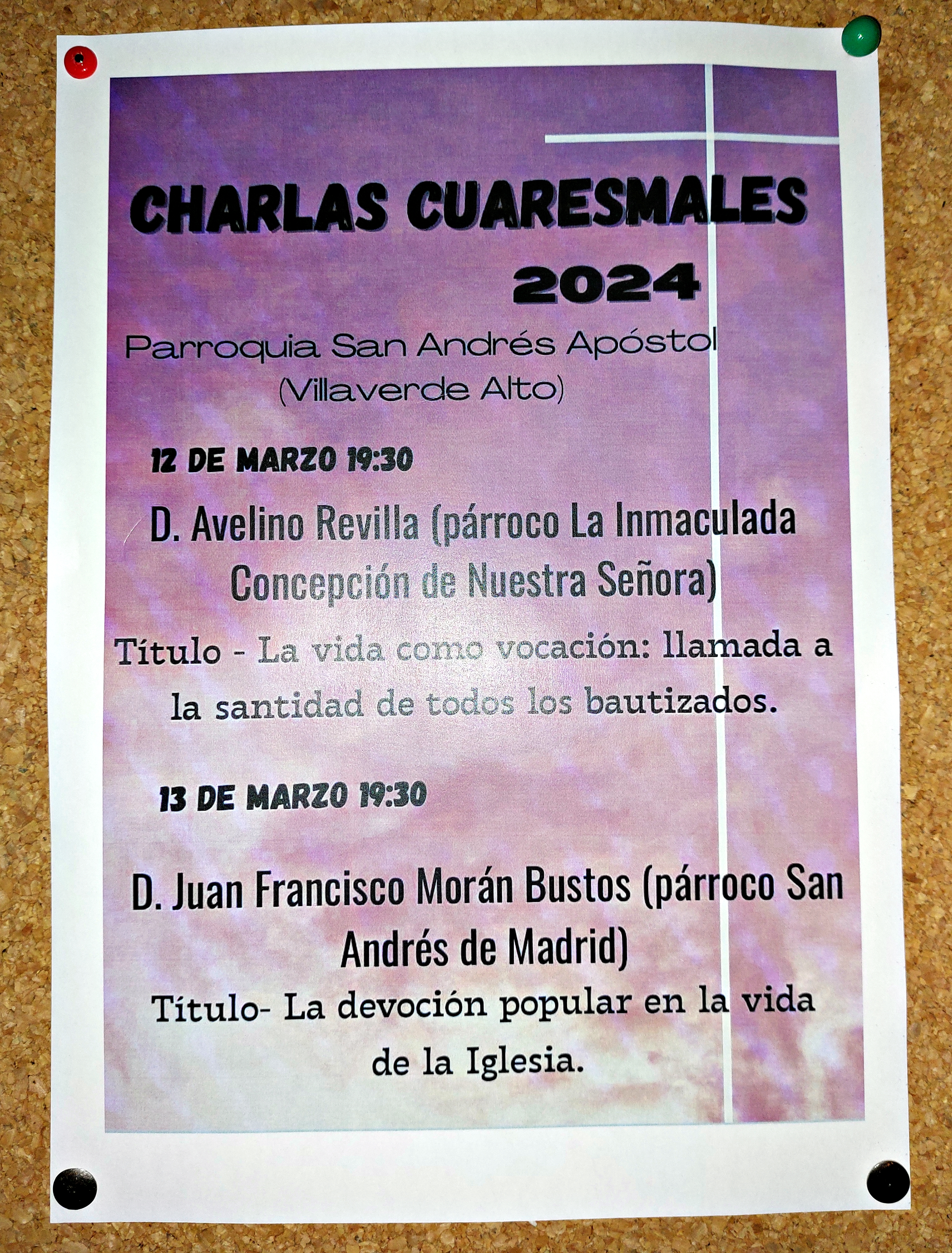 11 de marzo de 2024 Os recordamos que dentro del programa de CUARESMA el Martes 12 y Miércoles 13 de Marzo, tendrán lugar las CHARLAS CUARESMALES a las 19.30h, y estarán a cargo de D. Avelino Revilla y D. Juan Francisco Morán Bustos.