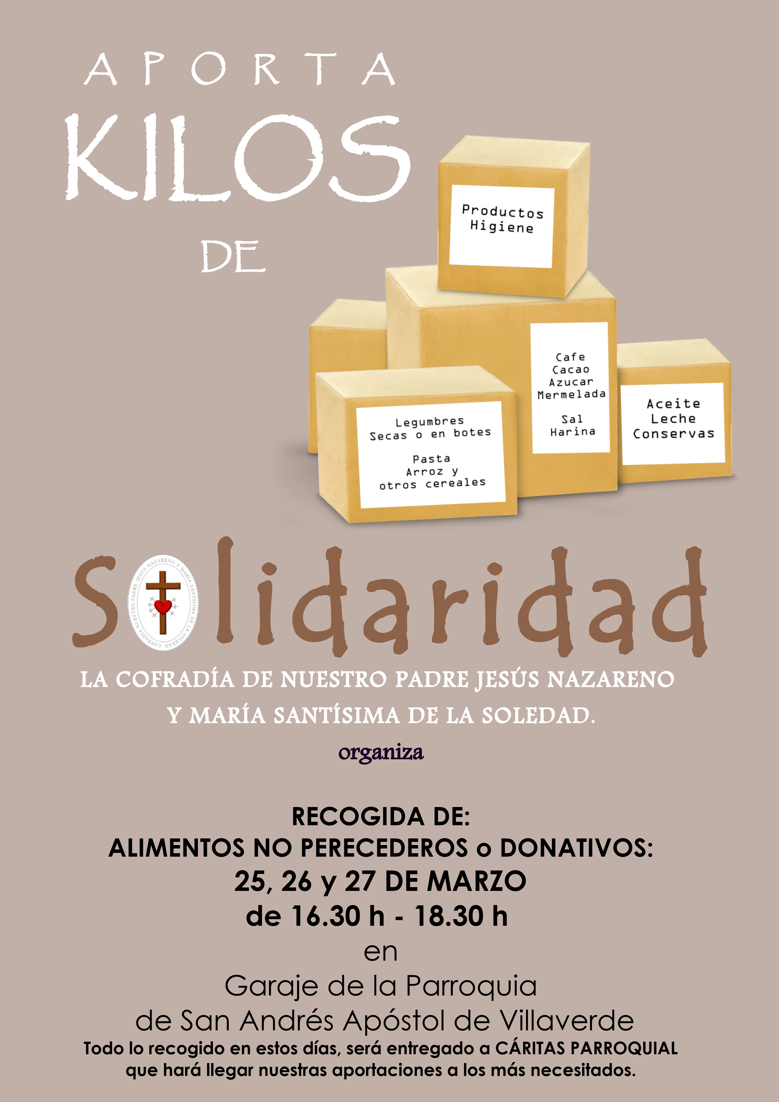Los próximos días 25, 26 y 27 de Marzo, llevaremos a cabo como cada año, la recogida de alimentos no perecederos o donativos, que se entregará a Caritas Parroquial para ayudar a los mas necesitados. Se pueden entregar de 16.30 a 18.30 horas en el Garaje de la Parroquia.