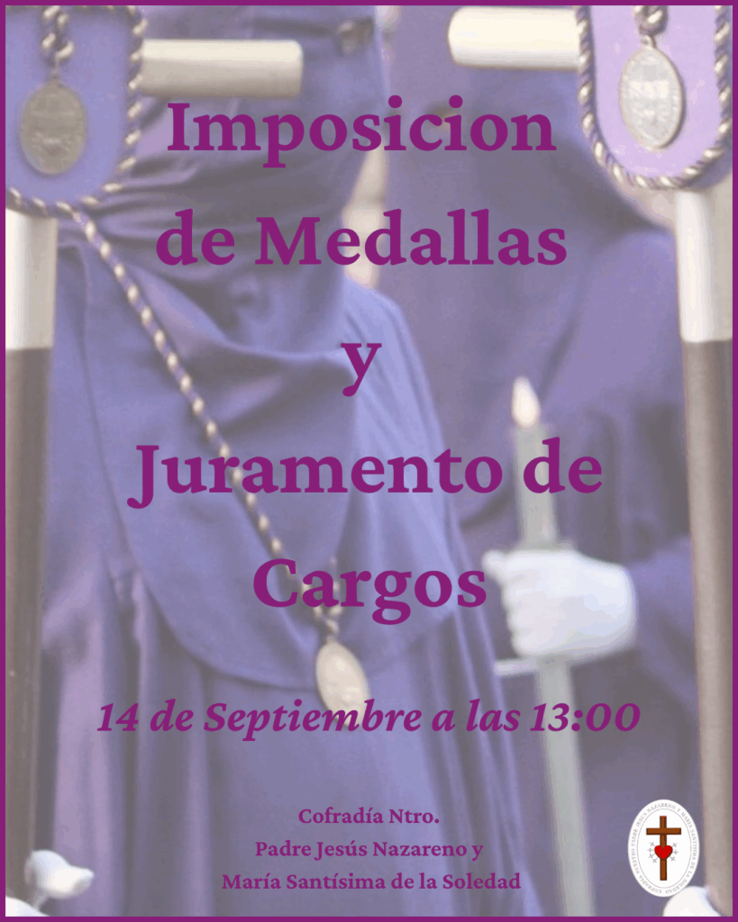 La Cofradía de Ntro. Padre Jesús Nazareno y María Santísima de la Soledad celebrará el solemne acto de Imposición de Medallas y Juramento de Cargos.