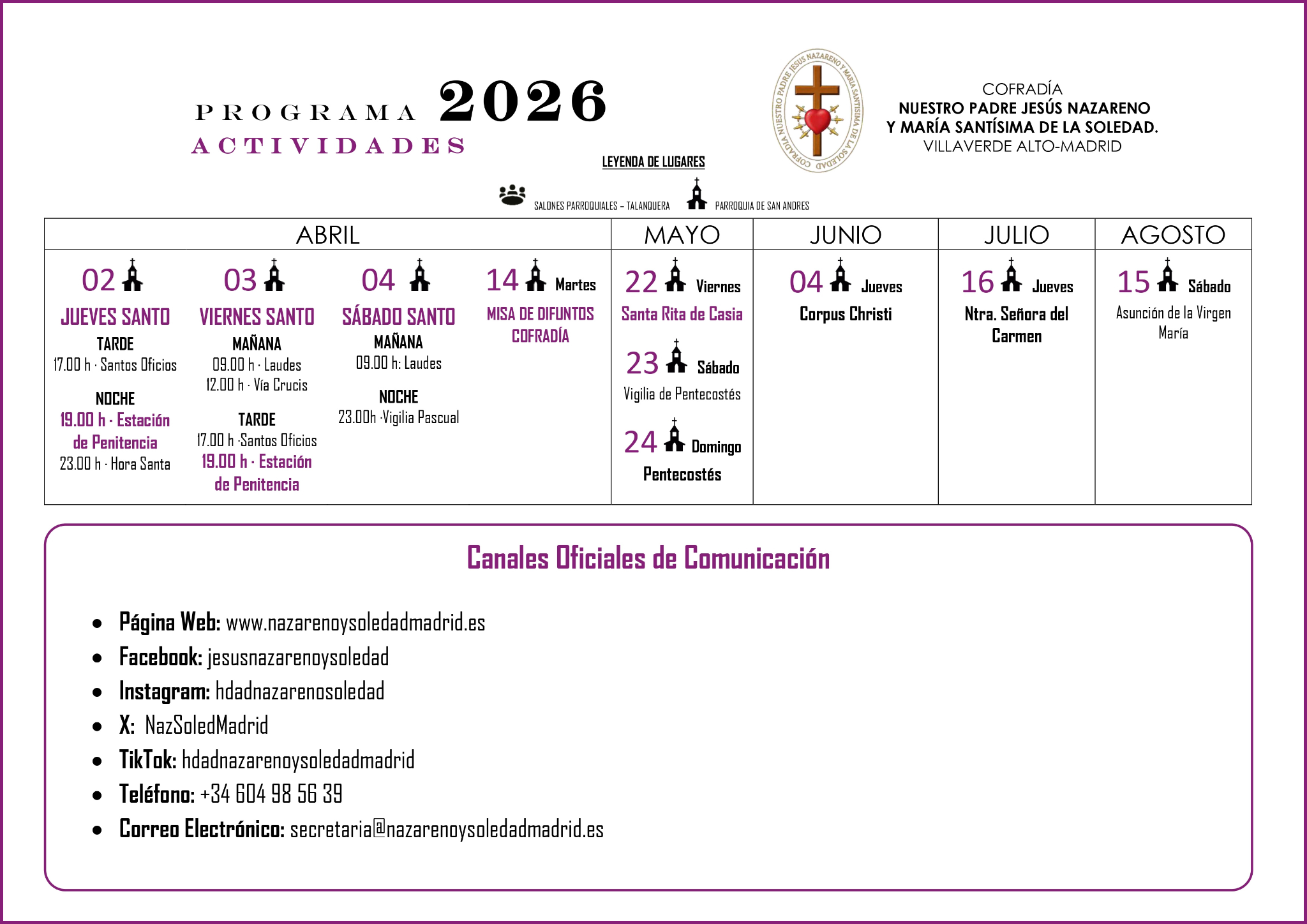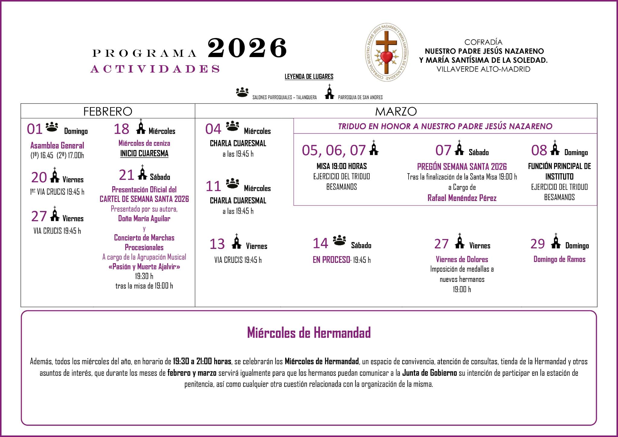 Consulta el calendario anual de actividades de la Cofradía Nuestro Padre Jesús Nazareno y María Santísima de la Soledad: misas, vía crucis, actos de Semana Santa y cultos extraordinarios.